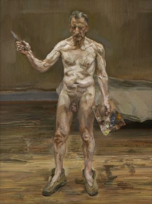 Lucien Freud – old, saggy, craggy, wearing a pair of unlaced boots – holds a palette knife in one hand lifted in gesture at the canvas we look at. I think this is his masterpiece. It’s merciless, ugly. He looks at himself and sees man as monster. He’s famous, of course, for his portraits of other people. But those never reveal the character of the sitter; they simply show Freud’s loathing of humanity and his agility with a paintbrush. In this self-portrait, he reveals himself boldly. Did he like himself?