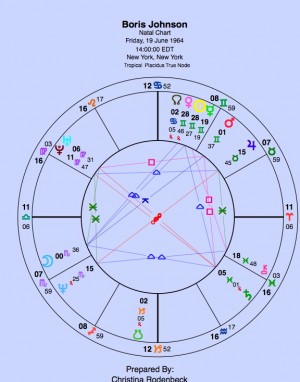 Boris’ Angles are close to the UK 1801 Angles. The UK has Sun in Cap conj IC square to Uranus Rising in Libra, so he’s strongly connected to the British character and its desire on the one hand for hierarchy, for toffs (Cap) and its paradoxical rebellion against that and the eccentricity (Uranus).