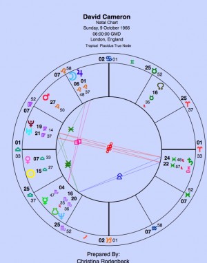 Saturn has been passing through the first house of both chart for about two years. For Cameron, it’s also been on his Sun – and frankly, after the first flush of winning last year’s election and creating the coalition, it’s been nasty. Saturn certainly brought responsibility. But things have not gone well for the coalition government despite a Royal Wedding and the Olympics, circuses which ought to have lulled the populace into submission. It’s lurched from one fumble to the next with a bit of tripping over the feet in between.
