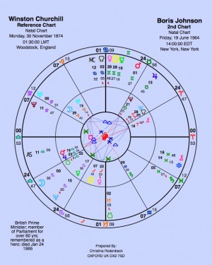 His progressed chart looks OK too, with Mars-Venus-NN conjunct in an applying opposition to the UK’s Sun. This trend will last for years, so I’d expect him to carry on doing well in the public eye. His synastry with the UK chart is also good, but not remarkable. I suspect Johnson’s affinity is with London – for which I have no chart – and perhaps not with the rest of the country. However, there is one other Boris factor that political commentators tend to shy away from. He is weirdly reminiscent of the most revered Prime Minister of the 20th century, another rumpled, eccentric toff with the common touch who started life as a journalist, Winston Churchill. Everyone thought he was a fool too, until the country needed him.
