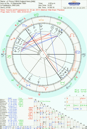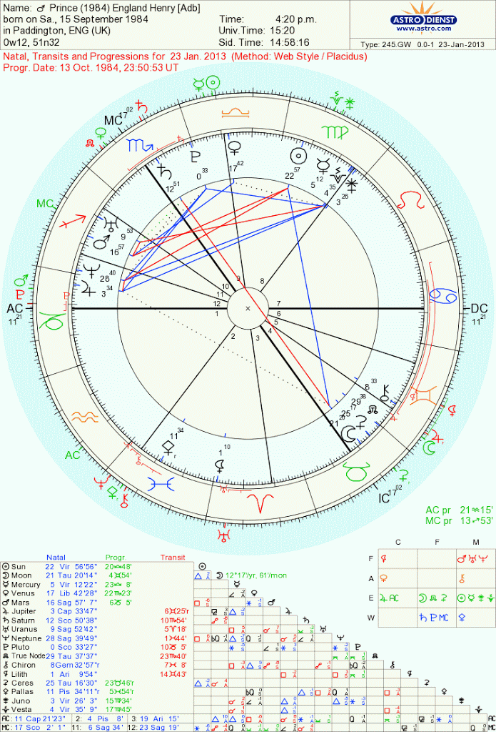 Looking at the prince’s chart, you can see that he is a natural-born soldier. His Saturn in Scorpio is a mark of military leadership. I expect he is brave (like his gran). With Mars, the warrior planet adventurous and athletic in Sagittarius, he may well be involved in more foreign wars, if he can stay alive through this one. What I fear is that this stupid interview will make him a personal target, and with Pluto on his Ascendant that seems quite possible.