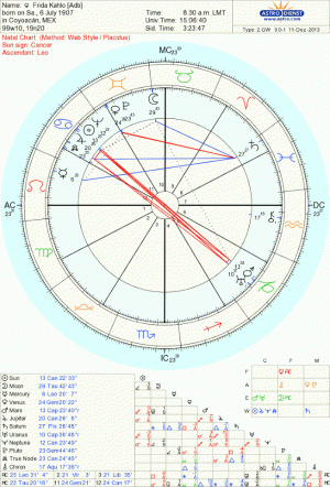 Venus/Pluto sextiles the Leo Ascendant. She is most famous for her numerous self-portraits. Leo is the sign of self-expression, the Ascendant is the face you show the world. She had to make those paintings.