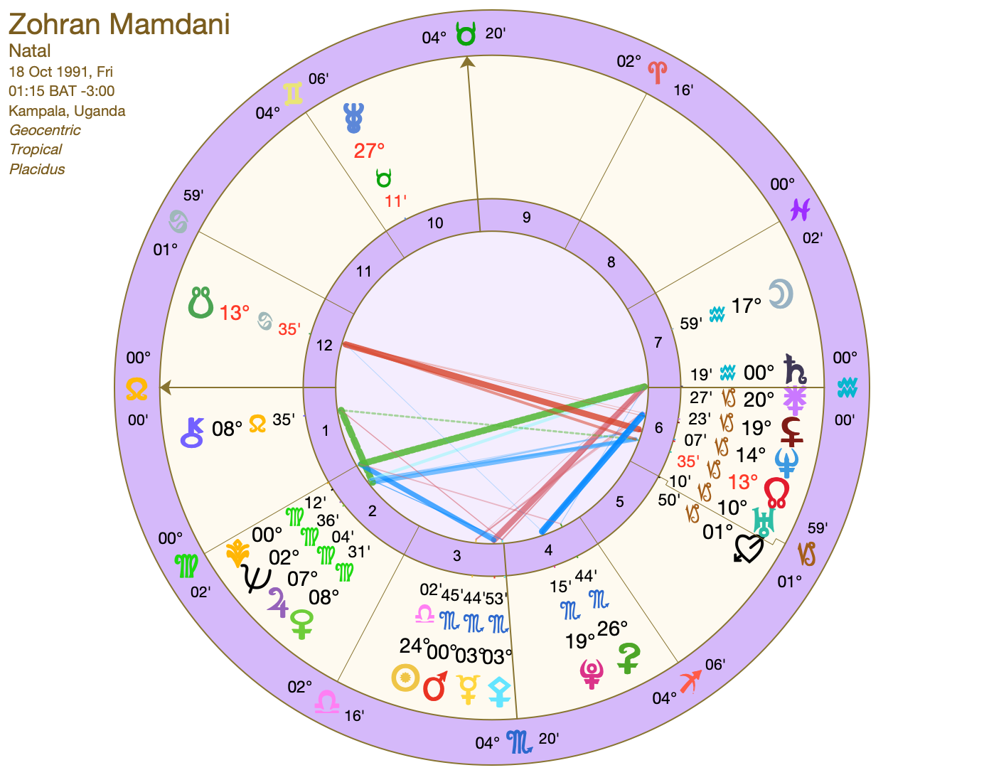 You will be unsurprised to see that Zohran Mamdani was born, if his birth time is right, with an ascendant at 0° Leo, Saturn at 0° Aquarius on the Descendant, Mars at 0° Scorpio, and a whip-smart combo of Mercury and Pallas at 3° Scorpio.